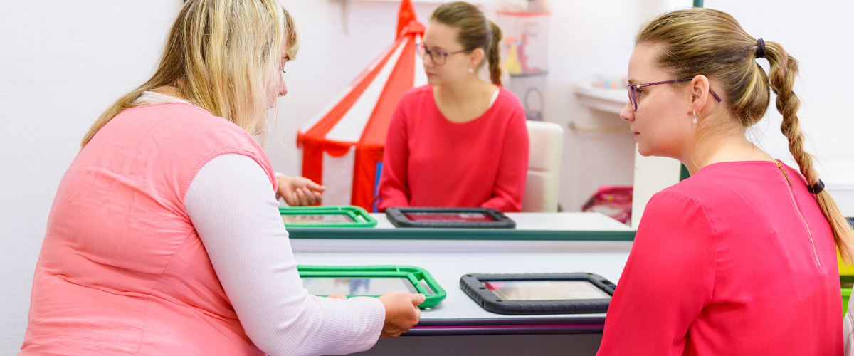 therapist with child using aac on an ipad